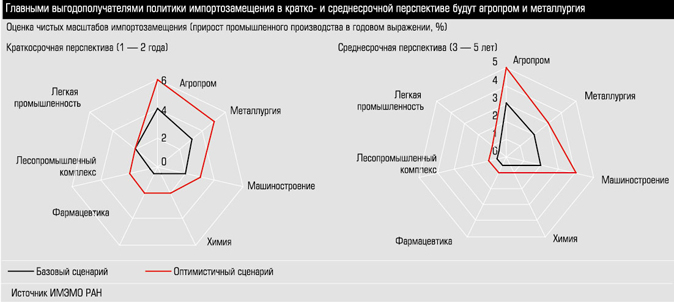 В столь мрачной картине в ИМЭМО РАН попытались найти позитивные проблески. По мнению ученых, от политики импортозамещения и санкций в краткосрочном периоде в относительном выигрыше останутся только две отрасли: АПК (прирост выпуска на 4 — 6%) и металлургии (3 — 5%). «Получение более долгосрочного эффекта требует значительного (не менее 5% в год) прироста инвестиций, что крайне маловероятно ввиду ограниченного доступа к капиталу», — уточняет Сергей Афонцев.