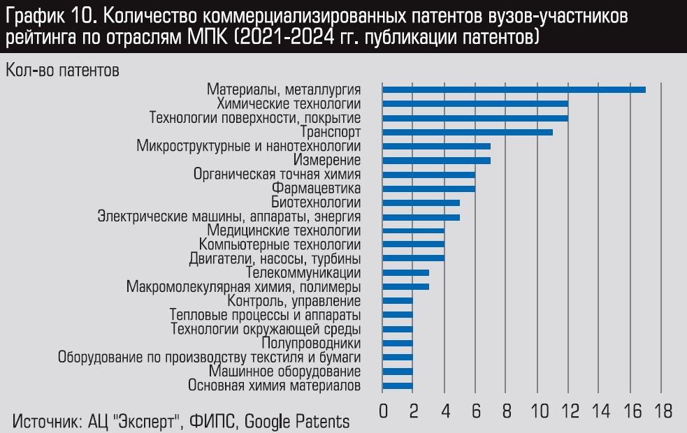 Среди отраслей коммерциализированных патентов по числу патентов лидируют Материаловедение, Химические технологии, Технологии поверхности и покрытия, а также Транспорт (график 10).