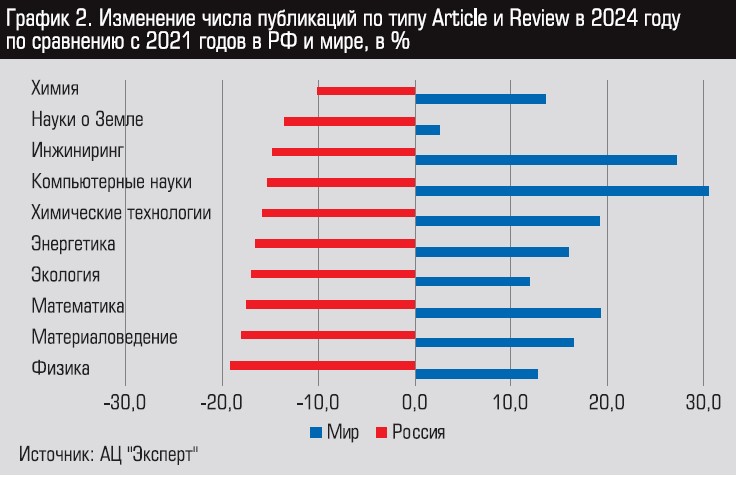 Негативная публикационная динамика отразилась на всех предметных областях (график 2). В срезе статей Article и Review особенно сильное падение переживают Физика (19%) и Материаловедение (18%). Стоит отметить, что среди 10 инженерных областей минимальное снижение демонстрирует Химия (10%).
