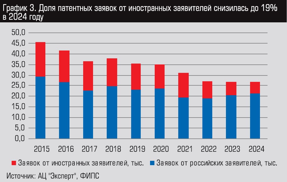 За период 2015–2024 годов положительный прирост по патентным заявкам наблюдался только дважды — в 2018 году на 4% и в 2024 году менее чем на 0,1%. Однако с 2022 года число ежегодных патентных заявок установилось в пределах 26 тыс. заявок и удерживается уже третий год.