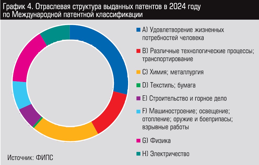 Небольшие сдвиги также произошли в отраслевой структуре выданных патентов по Международной патентной классификации (МПК) в 2020–2024 годы (график 4).