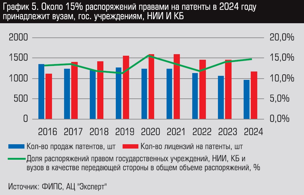 Несмотря на снижение количества договоров о распоряжении правами на патенты, доля вузов (а также КБ, НИИ и гос. учреждений) в общем объеме договоров на передачу прав возросла с 11,8% в 2022 году до 14,7% в 2024 году и почти сравнялась с показателем 2020 года.