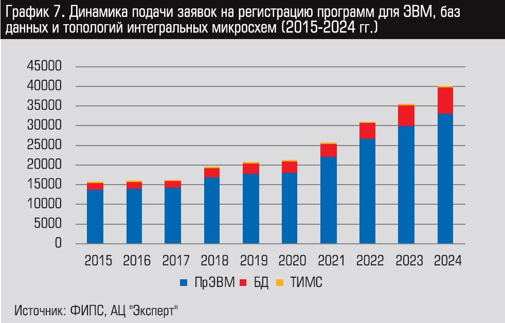 За последние 4 года (2021–2024 гг.) средний прирост числа заявок на ПрЭВМ, БД и ТИМС ежегодно составляет порядка 17%, что в разы превышает средние приросты до 2021 года (график 7). При этом доля заявок от иностранных заявителей в этом сегменте патентования крайне мала — менее 1%.
