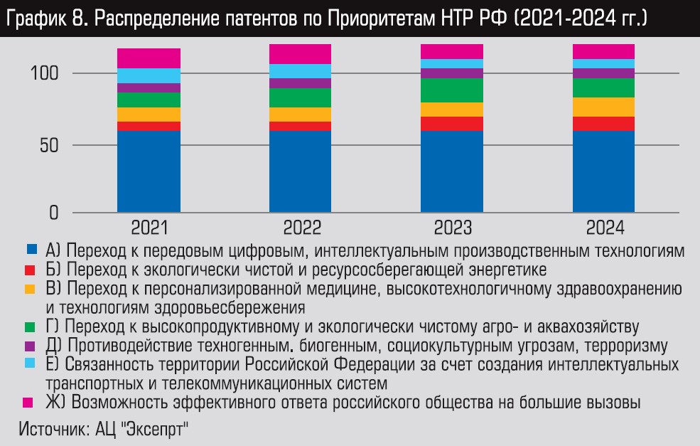 Распределение принадлежности патентов к различным Приоритетам НТР РФ довольно неравномерное — превалирующую долю на протяжении 2021–2024 годов занимает приоритет «Переход к передовым цифровым технологиям» (более 58%, и продолжает расти) (график 8).