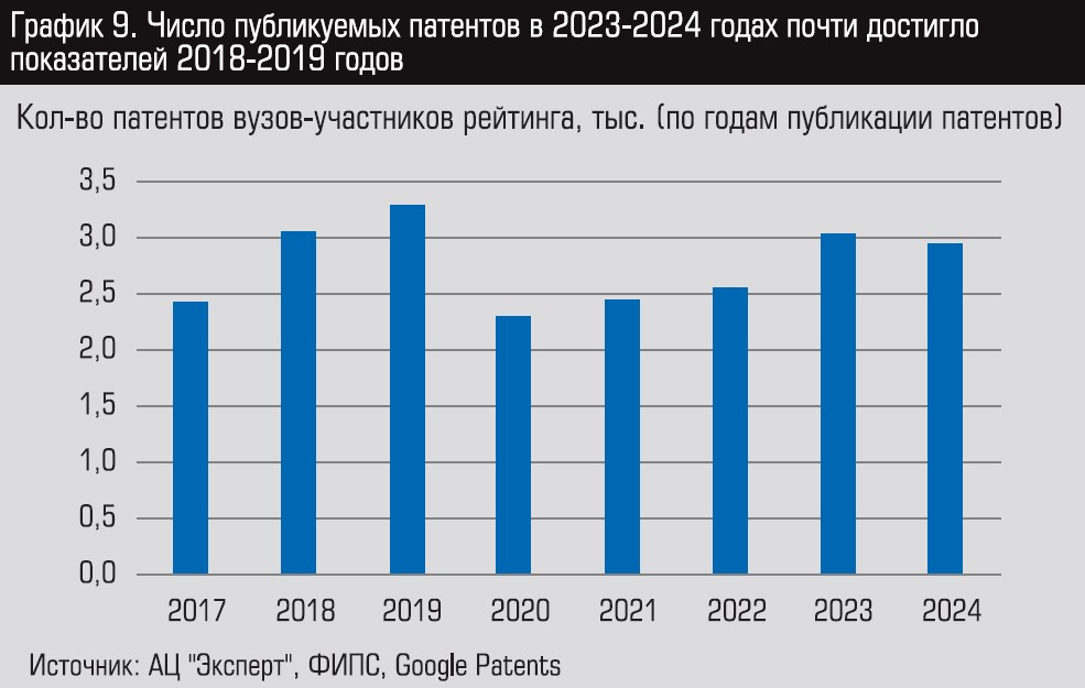 С 2017 года 80 вузов — участников рейтинга опубликовали более 22 тыс. патентов и около 1 тыс. патентов из них было коммерциализировано (график 9). После падения числа опубликованных патентов в 2020 году почти на 30% участники исследования активно наращивали объемы и почти достигли показателей 2019 года. За 2021–2024 годы средний прирост числа опубликованных патентов составил 7%.