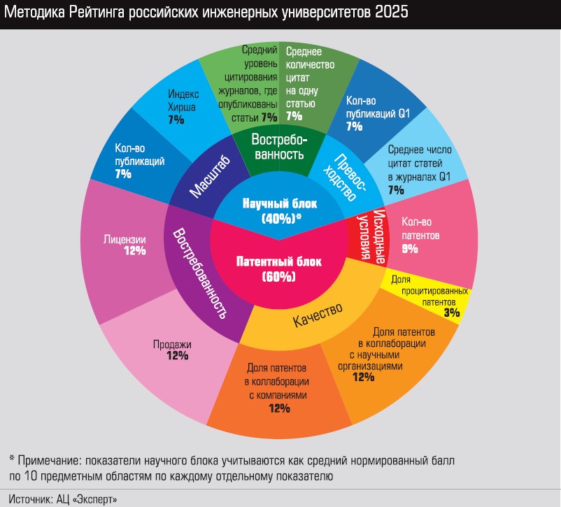 Научные достижения вузов анализируются через призму качества публикаций, технологические — через анализ качества патентов. Вес первого блока — 40%, второго — 60%.