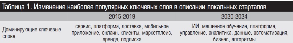 В России наиболее популярными направлениями деятельности для стартапов остаются ИТ, разработка ПО и искусственный интеллект (график 1). Анализ ключевых слов в описаниях компаний показал значительные сдвиги между периодами 2015–2019 и 2020–2024 годов (таблица 1). Зафиксирован резкий рост упоминаний ключевых слов «Искусственный интеллект» (+88%) и «Большие данные» (+118%). В то же время популярность таких фраз, как «Платформа / Сервис / SaaS» (-15%) и «Маркетплейс» (-28%), снизилась.