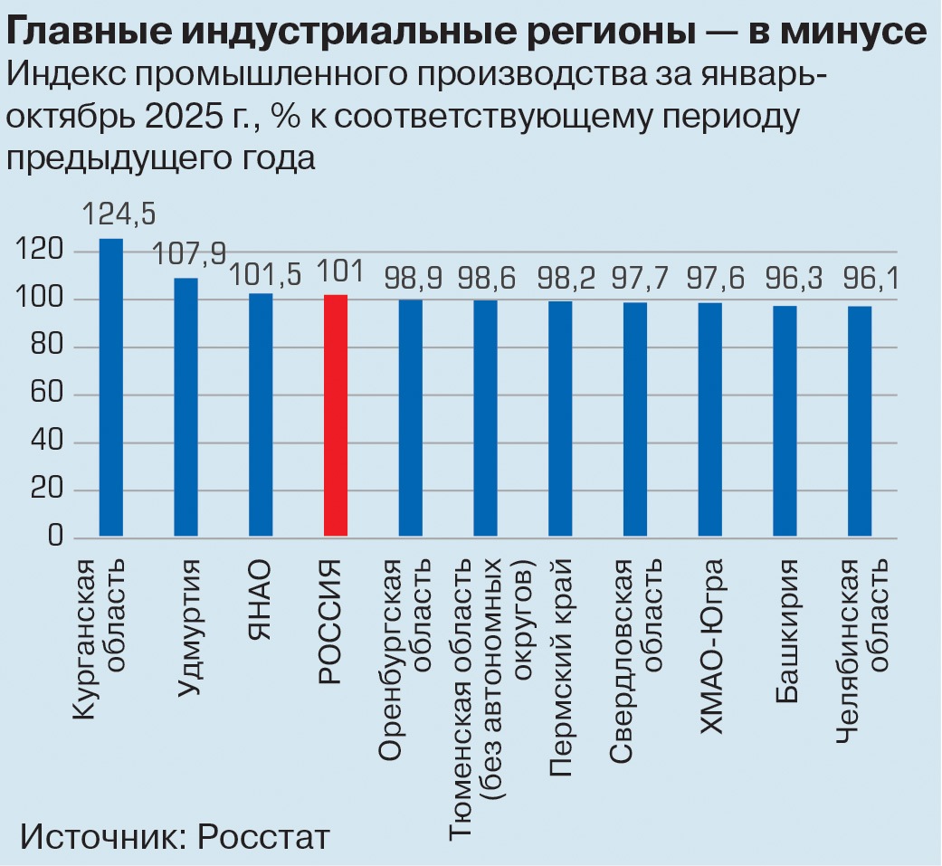 По данным Росстата (более поздних пока нет), в октябре рост промышленного производства в Урало-Западносибирском макрорегионе показали семь субъектов РФ из десяти (для сравнения — в сентябре таковых было всего четыре). Так, за октябрь год к году объемы промышленности выросли в Курганской области на 30,4%, Ямало-Ненецком автономном округе на 6,3%, Удмуртии на 5,1%.