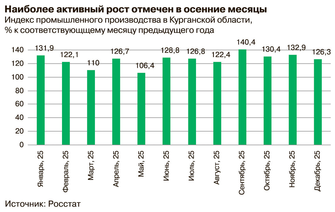 Промышленность Курганской области завершила 2025 год с отличными результатами. Индекс промпроизводства составил 125,2% (здесь и далее — к 2024 году). Это лучший показатель не только среди всех десяти субъектов РФ Урало-Западносибирского макрорегиона, но и по всей стране.