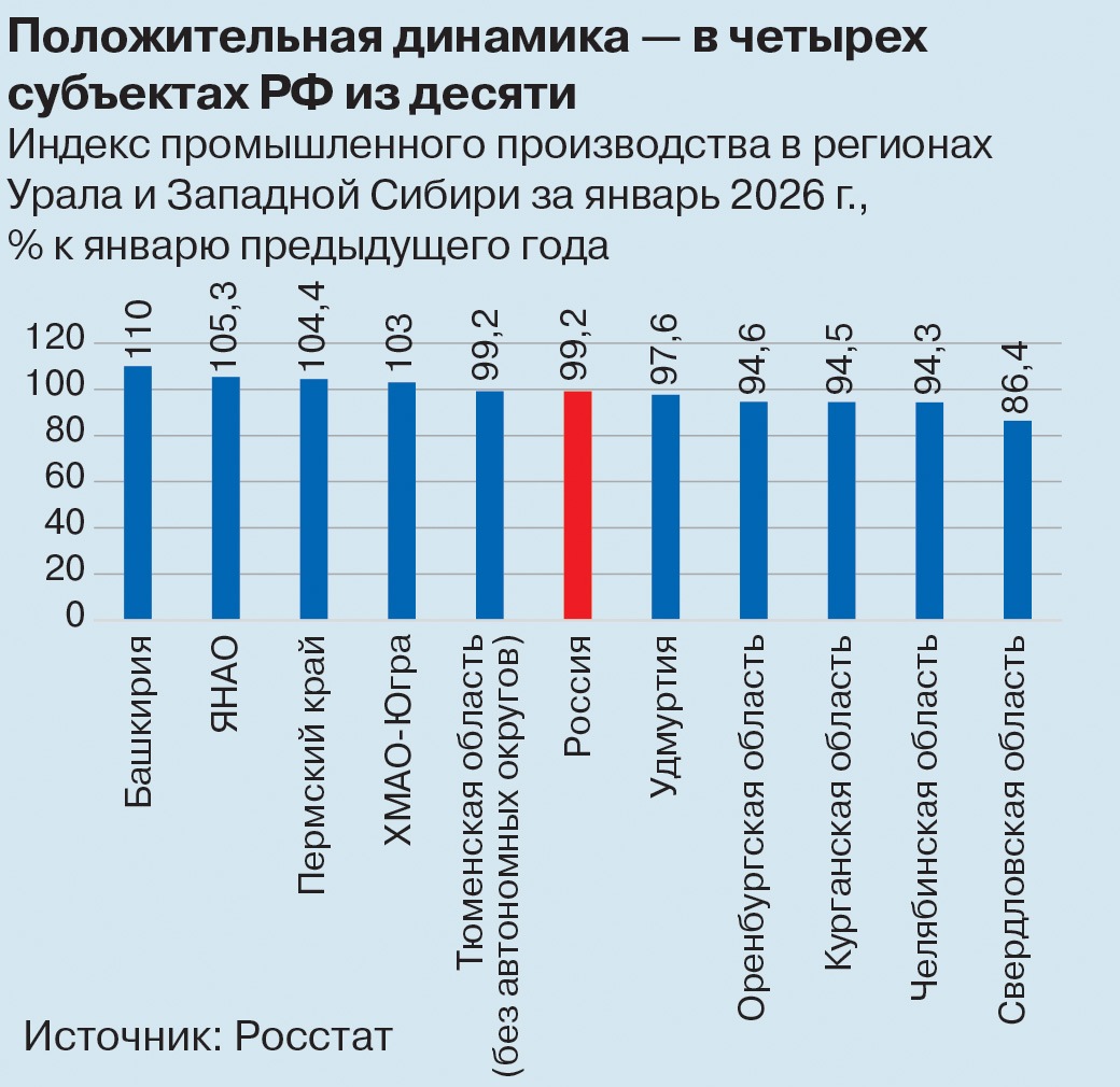 Начало года сменило лидеров промышленного роста в Урало-Западносибирском макрорегионе (здесь рассматриваем десять субъектов РФ). Напомним, практически весь прошлый год по данному показателю лидировали Курганская область, Удмуртия и (с большим отрывом от первых двух) Ямало-Ненецкий автономный округ. По данным Росстата, за январь 2026 года в призовой тройке по динамике развития промышленности оказались Башкирия, ЯНАО и Пермский край, показавшие рост соответственно 110, 105,3 и 104,4% (здесь и далее — к январю предыдущего года).