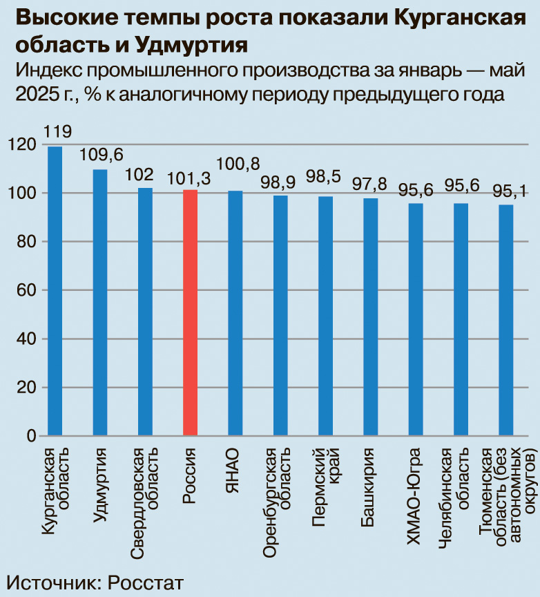 Только четыре из десяти субъектов Федерации на Урале и в Западной Сибири смогли показать рост промышленного производства за январь-май 2025 года (здесь и далее — по сравнению с тем же периодом предыдущего года). По данным Росстата, объемы промышленности Курганской области за рассматриваемый период выросли на 19%, Удмуртии — на 9,6%, Свердловской области — на 2%. Также в плюсе осталось промпроизводство Ямало-Ненецкого автономного округа, прибавив 0,8%.