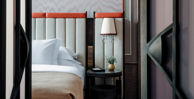 Дизайн Авторских номеров говорит о преемственности, верности наследию «Метрополя». Дотроньтесь до ручки шкафа — и обнаружите первую букву названия гранд-отеля, поднимите взгляд на высокие потолки — и увидите сохранившуюся технику шатрового покрытия (напоминание об историческом куполе ресторана), когда полотно потолочного пространства не просто задано прямыми углами, а удерживается формирующимися у его основания сводами.