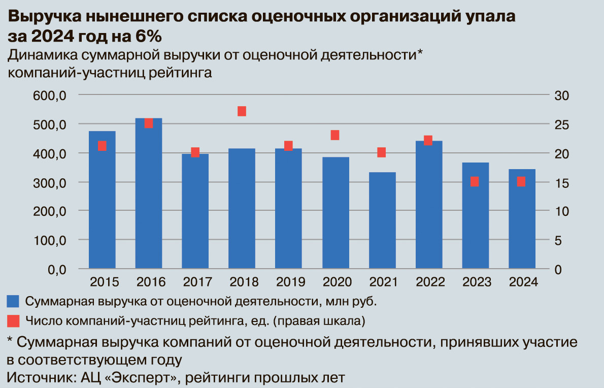 По результатам обработки анкет совокупная выручка нынешнего списка оценочных организаций упала за 2024 год на 6,3% и составила 343,5 млн рублей. С поправкой на инфляцию (по данным Росстата, 9,5%) фиксируем падение на 15,8%. Это заметное проседание, ведь годом ранее мы отмечали темп роста суммарных доходов участников рейтинга на уровне 33%.