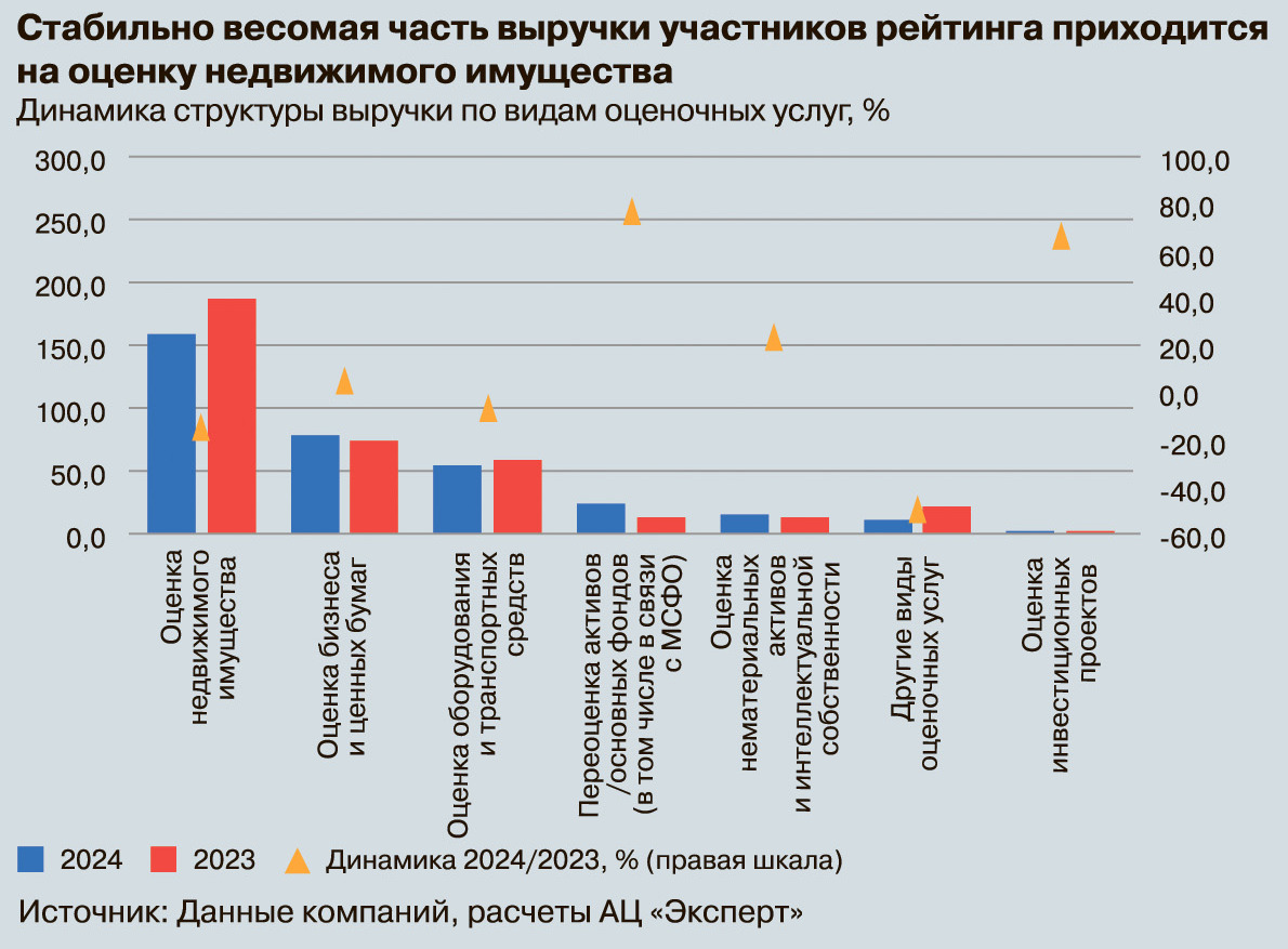 И тем не менее самый большой вес в структуре суммарных доходов участников рейтинга по-прежнему занимает оценка недвижимого имущества. В 2024 году выручка от этого вида оценки составила 159 млн рублей (46% от совокупной выручки), снизившись за год, по сопоставимым данным, на 14%.