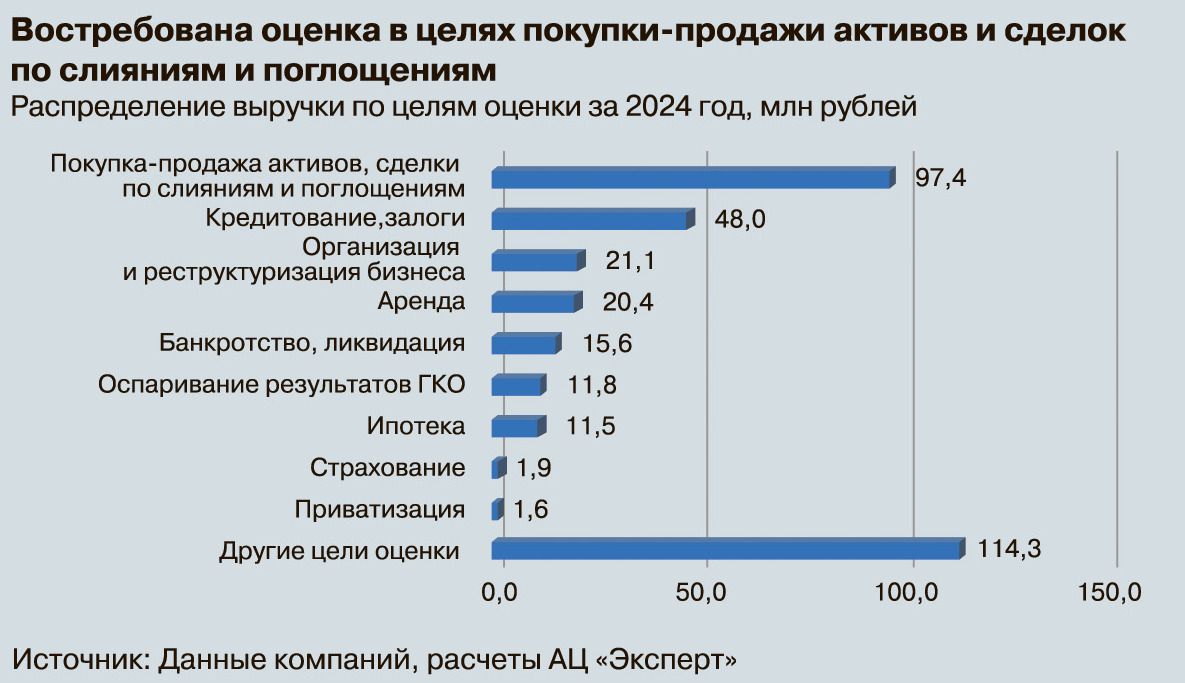 Услуги оценщиков требуются еще и в случаях, когда бизнесу приходится проходить юридические процедуры, связанные с ухудшением экономики компаний — банкротство, реструктуризация, продажа бизнеса. В сложной экономической ситуации, как правило, таких сделок становится больше, и спрос на оценку для этих целей растет. Это подтверждают и наши расчеты, и мнения участников исследования.