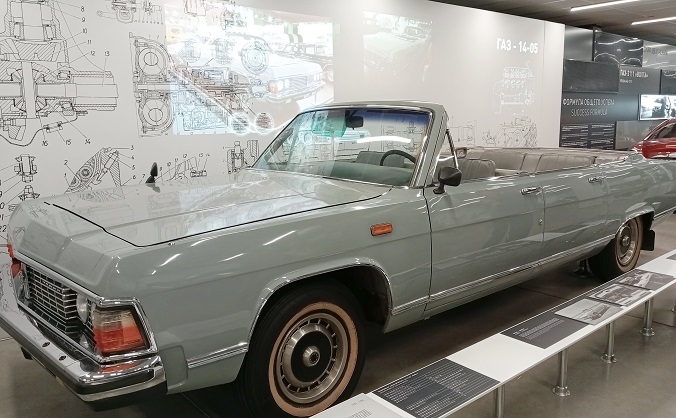 В 1970 году начался массовый выпуск «двадцатьчетверок». За руль бежевой ГАЗ-24 автор этой статьи села в возрасте 10 лет. Тогда он показался тяжелым и неповоротливым. Автомобиль, по воспоминаниям отца, был устойчивый, вместительный, простой в ремонте и обладал высокой проходимостью. Всего автозавод собрал почти 1,5 млн «Волг». Ну и, конечно же, говоря о 70-х годах, нельзя обойти стороной начало производства «Чайки» нового поколения – ГАЗ-14 и открытого парадного варианта ГАЗ-14-05. Обе эти машины также представлены в экспозиции.