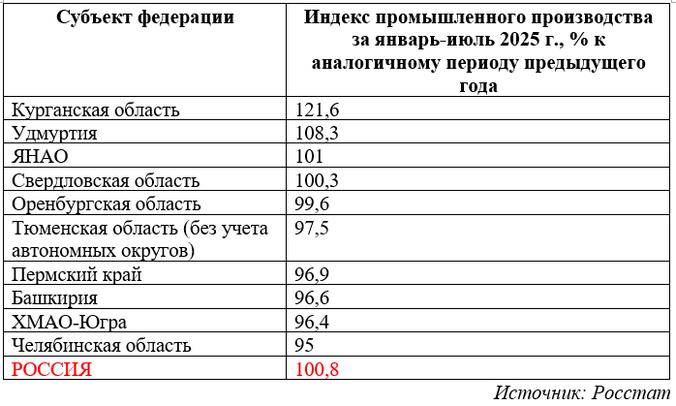 Росстат сообщил о ключевых результатах экономического развития десяти субъектов РФ на территории Урала и Западной Сибири за январь-июль 2025 года. В развитии промышленности ситуация практически не изменилась, по-прежнему рост промпроизводства отмечен только в четырех регионах: в Курганской области (плюс 21,6% к аналогичному периоду прошлого года), Удмуртии (плюс 8,3%), Ямало-Ненецком автономном округе (плюс 1%) и Свердловской области (плюс 0,3%).