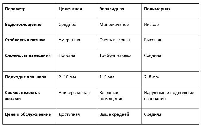 Чтобы не запутаться в характеристиках, полезно взглянуть на затирки через призму практических задач. Мы привыкли выбирать «по совету мастера», но гораздо надежнее опираться на свойства — влагостойкость, эластичность, стойкость к загрязнениям и удобство работы. Ниже приведено краткое сравнение трёх основных типов, которое поможет понять, какой состав подойдёт именно под ваши условия.