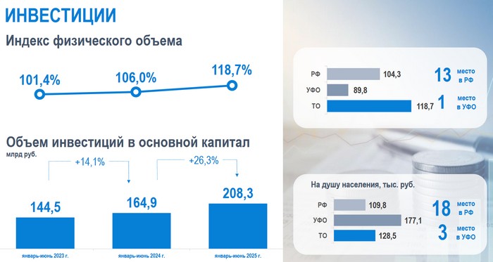 Объем инвестиций за январь — июнь 2025 года достиг 208,3 млрд рублей (118,7% в сопоставимых ценах). Доля промышленности в структуре инвестиций организаций (без субъектов малого предпринимательства) — 49,6%. По объему инвестиций на душу населения Тюменская область — на 18 месте среди субъектов РФ с результатом 128,5 тыс. рублей (по РФ — 109,8 тыс. рублей).