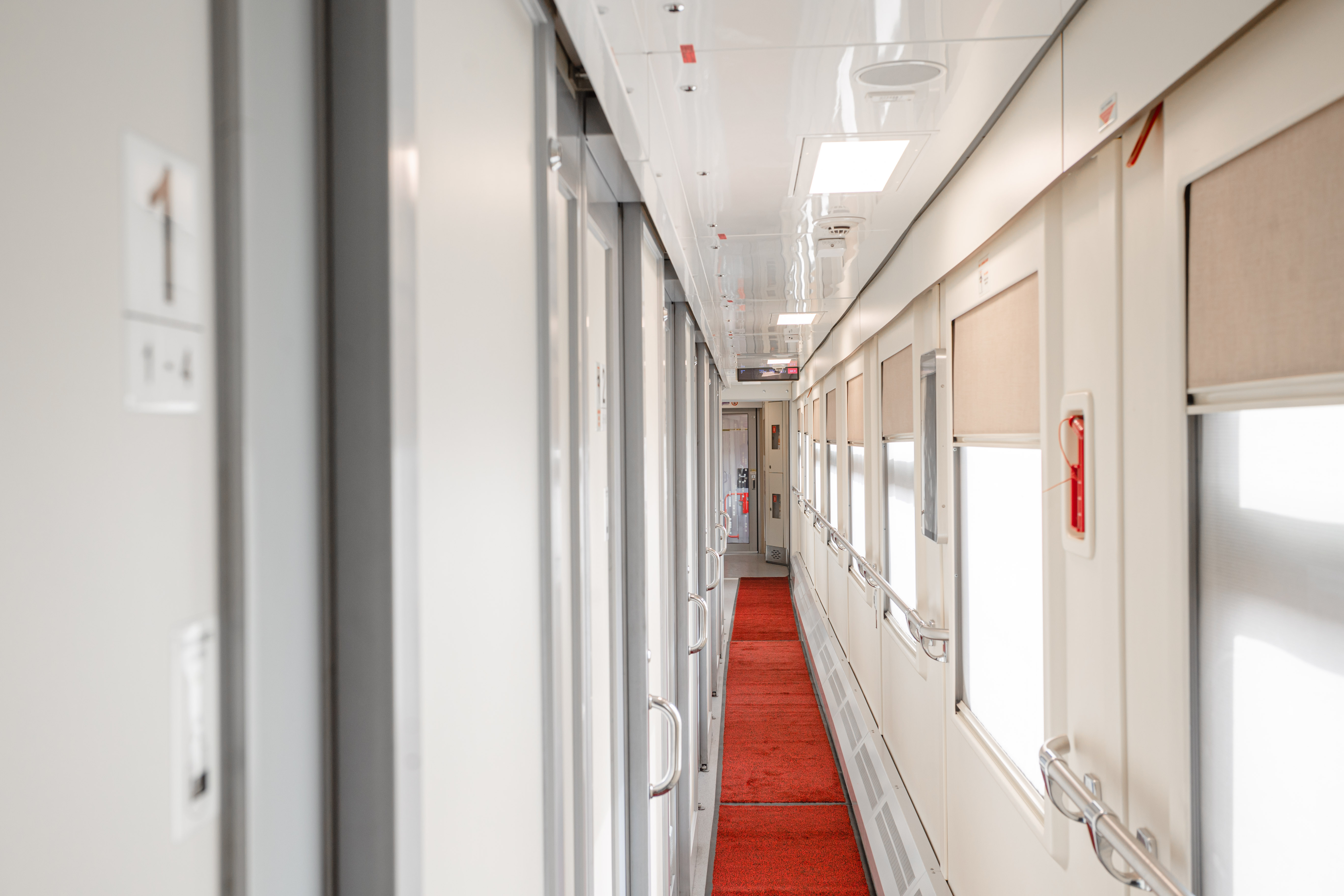 Пространство внутри купе максимально эргономично и приспособлено под потребности пассажиров: есть столик-трансформер, солнцезащитные светонепроницаемые шторы, персональные сейфы, розетки, USB-порты и светильники.