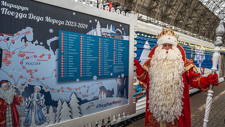 11 ноября Дед Мороз из Великого Устюга отправится в путешествие на поезде, специально подготовленном для него ОАО «РЖД». Поездка продлится 64 дня и завершится также в Великом Устюге 13 января 2024 года. За это время поезд проедет более 32 тыс. км, чтобы Дед Мороз посетил более 80 городов и подарил новогоднюю сказку тем, кто не может отправиться к нему в гости в Великий Устюг. На Свердловской железной дороге состав сделает остановки в 10 городах.